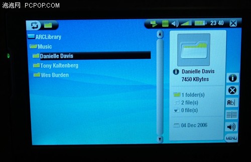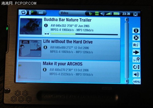 在音乐方面,爱可视704支持PlaysForSure (WMA) 服务,还支持MP3和WAV格式。在这里精明的爱可视野要算计一番,如果你想播放AAC格式的音乐,同样是需要另外购买的。除了这些,爱可视704还支持JPEG、BMP以及PNG格式的图片,在大屏幕上的显示效果也不错。