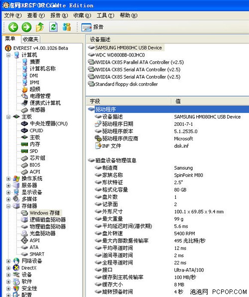 使用最新版的EVEREST Ultimate Edition,检测该款产品详细信息如上图所示。产品的型号为:SAMSUNG HM080HC USB Device,整体容量为80GB,5400rpm、8MB缓存、12ms寻道时间,ATA100 接口。除以上主流规格外,三星盘体具备了ImpacGuard专利技术,纠错性能十分高,可以有效地提高用户存储数据的安全性;同时采用NCQ本地命令排序技术,硬盘运行效率更高;利用“稳压芯片”技术,保护硬盘运行在高电压时不被烧毁;独有的SilentSeek减噪技术,减少共鸣所引起的机器振动;全新设计的NoiseGuard硬盘轴承,能够有效的抑制噪音,噪音只相差0.2分贝,做到了名副其实的静音。