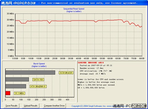 HD Tach是一款专门针对磁盘底层性能的测试软件,它主要通过分段拷贝不同容量的数据到硬盘进行测试,可以测试硬盘的连续数据传输率、随机存取时间及突发数据传输率。从测试成绩来看,酷e 80GB平均读取速度为28.7MB/s,突发速率为31.1MB/s,CPU占用率最高不过15%,在众多2.5寸移动硬盘中,这个成绩已经是相当不错的。