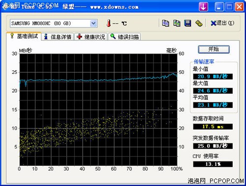 HD Tune与HD Tach测试原理差不多,同样是重点考察一款硬盘的读写处理能力。酷e 80GB在这里的表现也非常令人满意,平均传输率为23.1MB/s,突发传输率为25MB/s,数据存取时间为17.5ms,CPU占用率为13.1%。整个测试过程设备的速率十分稳定,没有较大的曲线波动,这点对于一款移动产品来说还是至关重要的。