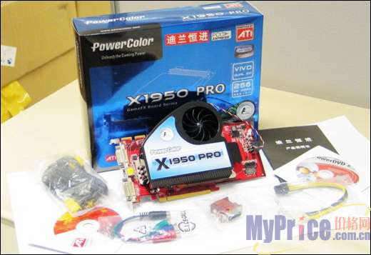 迪兰恒进的X1950 PRO输出接口采用了高端显卡惯用的Dual DVI+VIVO方案,附件也非常丰富,连线方面包括了色差输出、DVI转接头、6Pin电源线、S-video线等等,随卡附送一张完整版的《幽灵行动》游戏和PowerDVD系列使用光盘。
