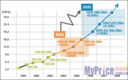 DDR3内存普及的关键在于Intel处理器的前端总线提升到何种程度,乐观的预期是2009年前端总线可以与DDR3 内存相匹配,而目前的趋势是多核处理而并非进一步提升总线频率,或许DDR3要靠成本优势战胜DDR2,对于IT业来说,那是非常遥远的2年之后。