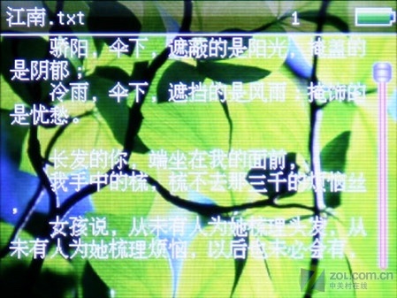 电子书功能支持TXT格式,支持书签功能,可以更换背景以及字体的颜色,这一功能对于艾诺 U60来说是很重要的,因为默认的电子书阅读背景美则美矣,但并不方便阅读,从图片我们就可以看出来,而背景颜色可更换则解决了这一问题,可以说相当人性化。