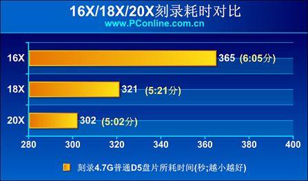 使用20倍速,数据写入速率达到更高的27.00MB/s,但是这个只是最后能达到的峰值写入速度而并不是刻盘时的平均写入速度。单纯的理论数据很难说明问题,下面我们从PConline评测室的权威数据来分析一下20X究竟比16X和18X快了多少: