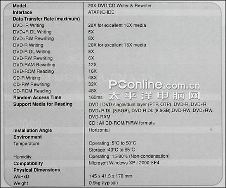 从LH-20A1P的具体参数来看,除了支持DVD+/-R的20X写入,它还可支持目前最快的12X DVD-RAM写入和8X DL单面双层盘片写入,而其数据缓存仍然是主流2MB,CD-ROM最大读写都是48X。