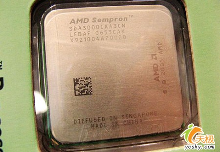 处理器编号从上到下依次为 “SDA3000IAA3CN”。其中“SDA3000”代表桌面用Sempron 3000+处理器,字母I代表Socket AM2接口;字母AA代表支持自动温控调节技术;数字3代表256KB二级缓存;字母CN代表为Manila核心。