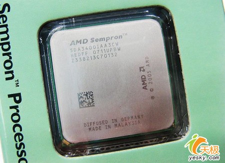 该处理器编号为“SDA3400IAA3CW”,其中SDA3400表示桌面用闪龙3400+处理器,I表示采用Socket AM2接口,AA表示具备智能温控技术,3表示采用256KB二级缓存,CW代表采用Manila核心。此外产品还支持DDR2-800双通道内存。支持AMD 64技术、Cool‘n’Quiet以及EVP技术。