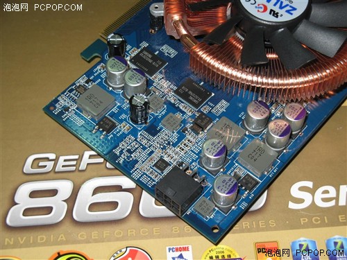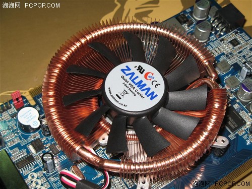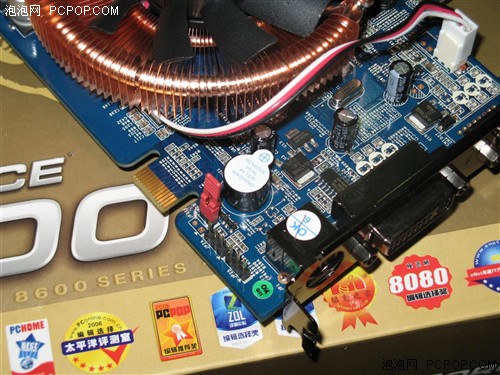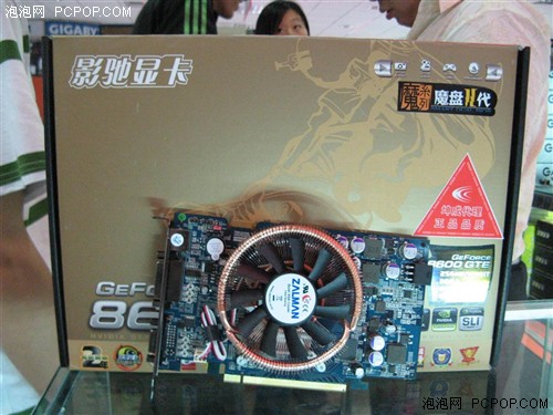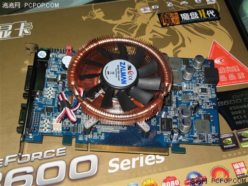 影驰这款8600GTE魔影版采用Zalman VF900全铜热管散热器,噪音小,只有18.5-25分贝,而公版风扇在全速下超过50分贝,目前这款散热器的市场零售价需要260元。Zalman VF900热管从核心出发然后环绕外圈的铜质鳍片,再采用大口径低速风扇散热,为显卡在极高频率下运行做好了充足的准备。