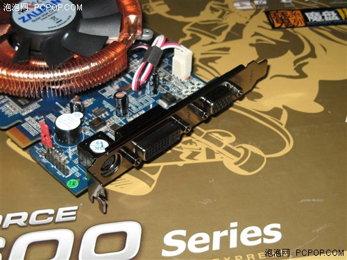 这款显卡采用了带金属屏蔽壳的DVI接口,同时提供了VGA和TV-OUT接口,保证视频信号的纯净输出,满足多种视频输出要求。虽然DVI输出并不需要低通滤波,但数字信号易受电磁干扰,因此影驰特意为DVI输出接口安装了金属屏蔽罩,而且经过了镀镍处理,抗氧化性和抗干扰能力更为出色。