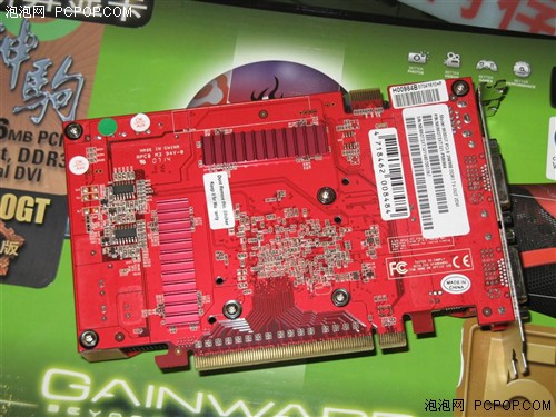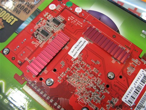 十分特别的,耕?86GT黄金版将显存放在了显卡背面,再加装散热片,这样的设计有两个好处。第一,正面元器件过于集中,意味着发热源集中,将显存置于显卡背面有效的分散了热源,第二,可以借助CPU风扇给显存进行散热。