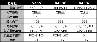 值得注意的是,不久前Intel推出了一款945GC芯片组,是英特尔定位于面向酷睿2入门级型号及Pentium E1000家族所推出的产品,同945GZ芯片组一样,945GC芯片组最高支持800MHz FSB外频。在内存规格支持方面,945GC芯片组支持Dual Channel内存技术,但每组内存控制器只能支持1组DIMM,也即是说,其最高支持内存支持容量由4GB下降至2GB。不过,945GC芯片组支持PCI-Express x16接口,可支持升级到独立显卡。相信这款产品很快将成为英特尔平台399元的主力军!