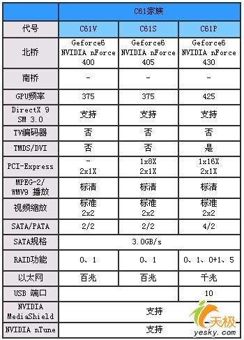 同时在PCI-E插槽上,C61S是削弱版的PCI-E 8X,C61V上甚至没有任何PCI-E图形插槽,而完整的PCI-E 16X和DVI数字接口都只有在加强型号的C61P中才能见到。即使某些功能有所削弱,但是拥有更高整合度的C61主要针对那些使用要求不是很高的一般用户,另外成本上也大大节省,更低的售价。目前399元的主要有MCP61V/S两个型号。