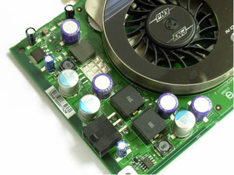供电部分,显卡使用三相回路的开关电路设计,有效保证了显卡在高频下工作的稳定性。元器件方面,大量采用了三洋TCNQ和NCC PSA固态电容以及高质量全封闭式电感,体现PNY务实、严谨的态度。