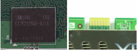 显卡使用了4颗三星1.0ns GDDR3显存,136 Pin封装,单颗规格16Mb*32Bit,显存规格256MB/128Bit。核心/显存默认频率675MHz/2000MHz。符合公版标准。显卡支持SLI技术,提供了MIO硬件接口,玩家可以方便地组建双卡系统。