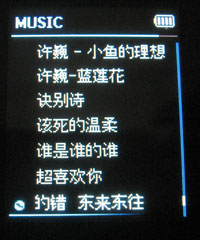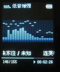 音频播放自然是一款MP3最常用的功能,三星K3支持MP3、WMA、OGG格式,在播放界面下,按菜单键则可以调出子菜单功能,提供了音效调节、图像EQ、播放模式、歌词等调节。具备五种音效:正常、声音、低音增强、3D音响效果以及音乐厅。而播放模式则有正常、重复文件夹、重复全部、重复单个、随机文件夹、随机所以等模式。