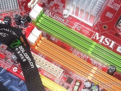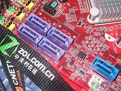 主板提供了4条DIMM内存插槽,最大支持8GB容量,完全保证了升级扩展的需求;另外,主板磁盘接口方面,提供了4+1个SATA2接口,其中4个紫色的为南桥提供,另外一个蓝色的为第三方芯片提供支持。为满足消费者的多种需求,还通过第三方芯片提供了一个IDE设备接口。