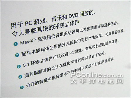 点评:作为一款廉价多声道回放产品,这款音箱的确具有不错的性价比。而多声道的优势在于他的环绕表现上,这款音箱可以让您在花费不多的情况下获得与2声道完全不同的听音体验。适合初级游戏玩家(包括TV Game玩家)以及好莱坞大片爱好者。