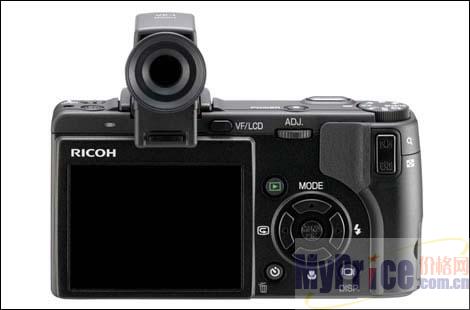 可拆卸电子取景器应该算是GX100的一大特色了,这个型号为VF-1的电子取景器通过一个数据接口和Caplio GX100连接,取景器被固定在机身的热靴上。这款VF-1的取景视野率为100%,分辨率20.1万像素,画面刷新率可以达到60fps。