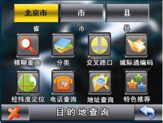 城际通坤达J530采用的是4英寸的16:9触摸屏,分辨率达到480×272像素,在色彩过渡及亮度调节方面都有着不俗的表现,比较令人满意。导航软件方面,它采用的是最新版城际通3.0,该图界面美观功能丰富,整体操作也算简单较容易上手。其内置的搜索方法包括模糊查询、分类查询、交叉路口查询、城际通编码查询、经纬度定位、电话查询、地址查询以及特色推荐。