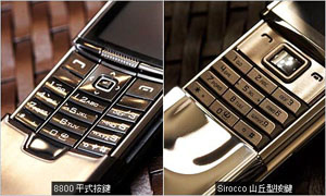 8800 Sirocco继续沿用了传统的直板风格以及8800的不锈钢金属机身,乍看下好象二者并无区别,但是加入了不规则线条结构,在灯光的反射下给人一种柔和的美,外壳上的凹槽也大大方便了拇指推滑盖的使用。按键也从平面式的细长键转变为山丘状层层叠叠,尽显“科技以人为本”的理念。