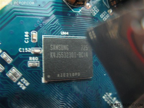 显存方面采用了三星1.4ns GDDR3显存颗粒,4颗全部设计在正面,128MB/128bit显存规格,默认显存频率达600MHz/1400MHz。