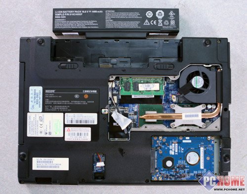 就我们拿到的这台样机来看,CPU部分采用单导热管+风扇的散热设计,其中导热管负责将CPU和显示芯片的热量导出,由风扇将热量排出机身。无线网卡在这台机器上并没有安装,内存也只插了一根,这些升级起来都是非常容易的。
