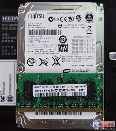 七喜S41的硬盘采用富士通80GB SATA笔记本硬盘,内存采用三星512MB DDRⅡ533笔记本内存。