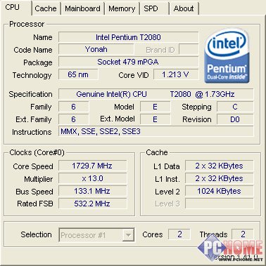 Intel奔腾双核T2080处理器,1.73GHz,533MHz前端总线,1MB二级缓存,不支持64位运算