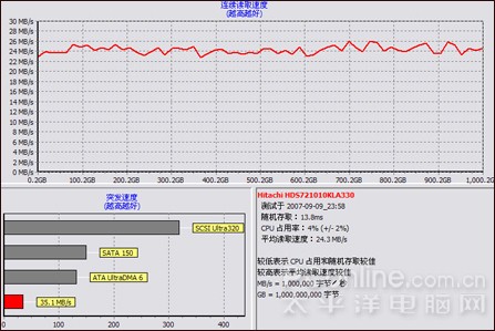 在HD Tach的测试中,忆捷H200(1TB)的表现同样出色,最大写入速率达到35.1MB/s,平均读取速率则达到24.3MB/s,平均寻道时间为13.8ms。CPU占用率为4%,比一般的移动硬盘要高另外,从HD Tach测试截图我们验证了ATTO测试的结果,在传输曲线上我们看到忆捷H200(1TB)的传输稳定性非常好,从开始到结束,峰高与峰谷之差不超过3M/S。