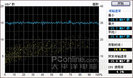 在HD 忆捷H200(1TB)在Tune的测试中的表现略逊于之前的两个测试,不过在传输稳定性方面依然出色!最大传输速度为15.7MB/S,最小传输速度为14.2MB/S,两者相差只有1.5MB/S,平均读取速率则达到15MB/S,存取时间为14ms,突发传输速率为15MB/S,CPU占用率为4.2%。从HD Tune的结果我们可以看到,传输曲线几乎在一条平稳的直线上,没有任何大的波动,与HD Tach测试结果十分吻合。