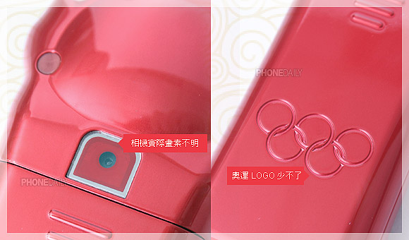 福娃手机背面有一组相机,实际画素不明,也没有自拍镜、补光灯等玩意,造型简单到极点。此外,电池盖上方还刻有象征世界五大洲团结的奥运环,突显这款手机是「奥运特别版」,不过它可不是「官方正式版」唷!