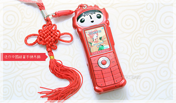 福娃欢欢这个吉祥物是专门为北京奥运订做的,造型本身就已经很有中国风味,有趣的是盒装内还附赠一条「中国结」吊饰,和全身红的福娃机凑在一起真是喜气洋洋。