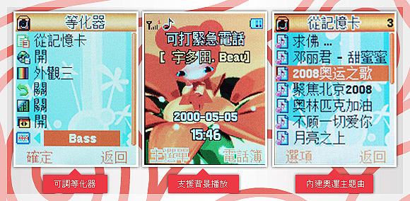 「麻雀虽小,五脏俱全」这句话很适合用在福娃手机身上,因为它能拍照、听 MP3,还支持 3GP、MP4 影音档案,多媒体功能和大部分的贴牌手机一样多。独立音乐播放器拥有三种面板风格可选,还具备 8 种均衡器模式,支持背景播放,随机附赠的记忆卡里面当然有多首和奥运有关的歌曲。