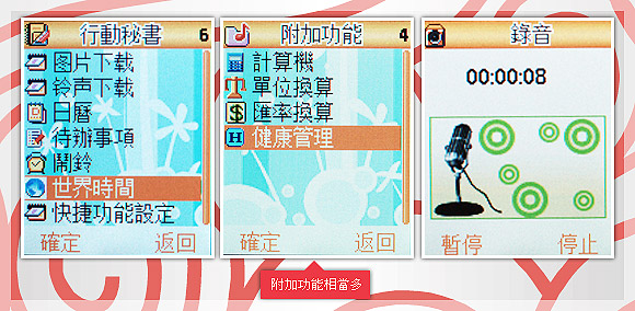 撇开多媒体功能不说,福娃手机还具备丰富的行动秘书、附加功能,一般手机有的东西它几乎都有,录音机、世界时钟、健康管理、行事历、备忘录、汇率换算等杂七杂八的功能它都大方送,诚意还挺够的。
