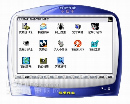 安装程序完毕后,该软件不会在开始菜单或桌面生成快捷方式,需要用户手动进入C:\Program Files\纽曼移动硬盘开打移动储存小助手。各项功能均在主菜单中,其中主要包括我的通讯录、我的邮件、网上搜索、定时关机,记事小秘书、爱眼小护士等等。在移动储存小助手的下方有12个操作按钮:复制、粘贴、删除、加密、解密等等,操作十分方便。