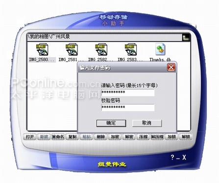 移动储存小助手在旅行者1.8T中进行文件加密、解密,操作简便,只需要选定需要加密或解密的文件,然后按下面对应的按钮,即可进行操作。同样,在选定的目录下也可以进行复制、粘贴、删除、重命名、压缩、解压缩等操作,同样简便,值得推荐使用。