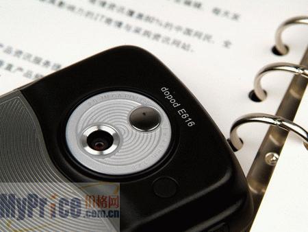 在外形上,多普达E616的感觉让人想到了之前的多普达686,而底部的操作键,又像极了多普达830。多普达E616那129.7×69.8×18.8mm的个头,根本不吧如今的超薄风潮当回事!多普达这款E616它内置了一颗200万像素的摄像头,同时一个相同大小的自拍镜设计在摄像头的上方,可惜的是并没有配置闪光灯。