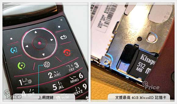 V8与V9都是RAZR2系列,老实说一句,摆在一起绝对很难分别。MOTO聪明地用颜色去区分,V9用酒红,加上依旧的亮丽反光设计,手感不俗兼好看。打开机盖,导航键周围有捷键,一按即上网,这也跟GSM的V8设计不同。