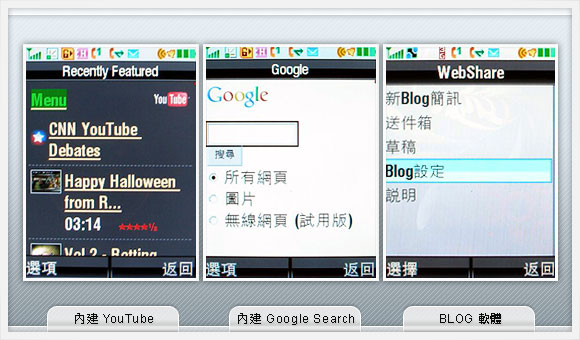 此外,手机内建WebShare应用,相机拍下的手机及短片可立即上传至Google Video及Flickr相片网站,立即与朋友分享。