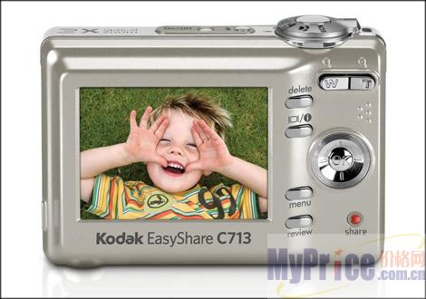 柯达 C713机身尺寸为91x65.7x37.3mm,重量约137g,采用SD/SDHC卡作为存储介质,使用两节AA型电池供电。虽然没有手动功能,但具有16种场景拍摄模式、3种色彩模式以及电子防抖功能。