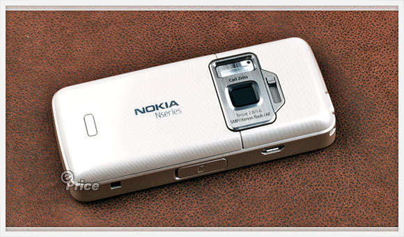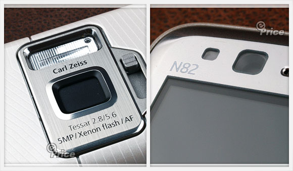背面最抢眼的就是相机镜头了。N82 仍然采用与 N95、N95 8GB 同等级的 500 万画素卡尔蔡司自动对焦相机,由镜头下方的说明文字可以得知,镜头采用 Tessar 结构,最大光圈为 F2.8,焦距则为 5.6 mm。最特别的是,N82 终于加入了氙气闪光灯,手机市场中具有氙气闪光灯的手机还真是不多,除了 N82 之外,只有 GIGABYTE g-Cam、LG KG920 / KU990、SE K800i / K810i / K850i,以及 2008 年即将上市的 Samsung G808,如果你对氙气闪光灯情有独锺的话,N82 也是一个不错的选择。