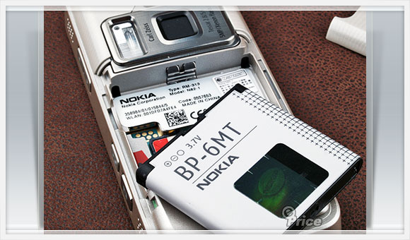 打开 N82 的背盖,可以看见 N82 用的电池是 BP-6MT 型号,容量为 1050 mAh,另外我们借测的手机是中国制造,组装也很扎实。