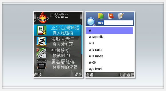 N82 内建「口袋擂台」程序,里面有许多台湾人爱玩的游戏,如 16 张麻将、大老二等等,不过要注意的是,这些游戏都是在线游戏,而且要到 12 月才会开通服务。此外,手机也有发音辞典,具备英英与英汉翻译功能。