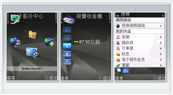 与 N95 8GB 相同,N82 内建「影片中心」程序,可以把手机中的影片集中管理,也能直接上网下载影片。「搜寻」功能则可以搜寻网络上的网页、图片,并可列出手机中的多媒体档案、行事历与讯息,是很方便的功能。