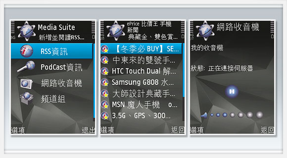 最后是「Media Suite」,它支持 RSS、Podcast 与网络收音机,可以浏览网络上的最新信息,不过网络收音机的部份最好还是经由 WLAN 收听,要不然如果手机没有吃到饱数据费率,月底你可是会被账单吓死。