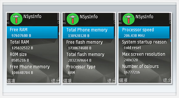 N82 在硬件功能方面,非常类似 N95 与 N95 8GB,这点由 NSysinfo 这个硬件测试软件也能得到证实。由软件提供的数据来看,N82 与 N95、N95 8GB 同样都用了 ARM 206 MHz 的处理器(仅供参考),在有截图软件加载的情况下,free RAM 大概有 93 MB 左右,也与 N95 8GB 十分相近。