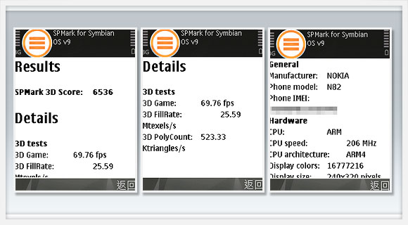 之后我们利用 SPMark 测试手机的 3D 效能,得到 6536 分的高分,也与 N95、N95 8GB 不相上下,表现十分亮眼。这样高分的原因其实和 N95 8GB 相同,就是 N82 支持硬件 OpenGL 加速,所以在玩 3D 游戏的时候表现特别好。