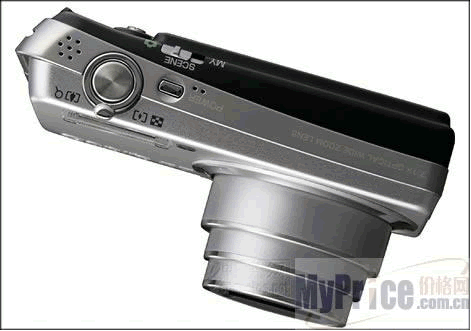 R7的镜头占据了机身正面约1/2的位置,镜头环采用了抛光处理,更显得其亮丽夺目。R7延续了理光小钢炮的特点,采用了一枚具有28mm广角的7.1倍光学变焦镜头,等效焦距为28mm-200mm,该镜头最大光圈为F3.3-5.2。这枚镜头的另一特点是使用了理光双回缩镜头系统,所以它能够将一枚等效焦距为28mm-200mm的镜头轻松安置在仅有20.6mm的纤薄机身上。