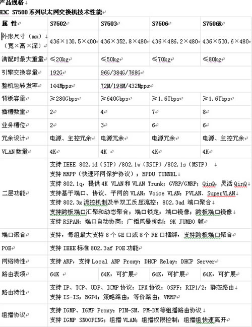 H3C S7500系列交换机是H3C公司面向以业务为核心的企业网络架构而推出的新一代高端多业务路由交换机。该产品基于H3C公司自适应安全网络的技术理念,在提供稳定、可靠、安全的高性能L2/L3层交换服务基础上,进一步提供了业务流分析、基于策略的QOS、可控组播等智能的业务优化手段,从而为企业IT系统构建面向业务的网络平台,实现通信整合,数据整合奠定了基础。