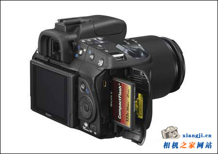 通过之前发布会的图片比较,不难发现α350和今年早些时候推出的α200很相似,两者正面除了手柄处的形状和右下角的像素字样,基本没什么区别,而背面通过对比α200和α700,也没有太大的变化,说明索尼已经对按键操控大体定型了,形成了自己独特的风格。在α350的右侧肩部,有一个明显的不同,多了一个硬件拨杆,这就是非常实用的Live View功能了。